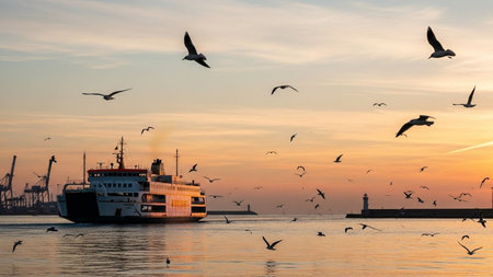 Ferry in the sea with seagulls in the background