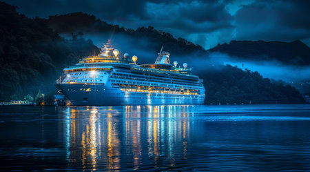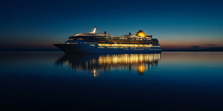 A magnificent cruise ship glows against a twilight sky, its reflections shimmering on tranquil waters. It embodies luxury and adventure, ideal for unforgettable, restful sea journeys