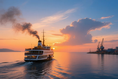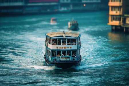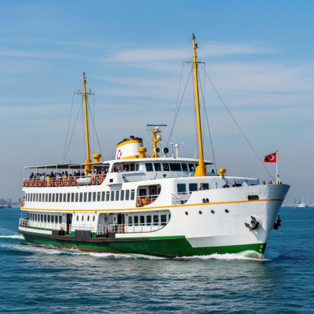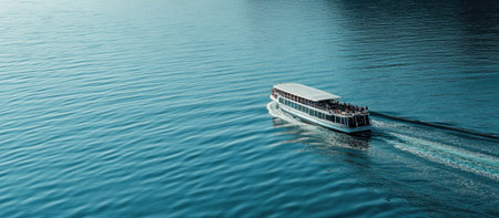 A ferry boat gliding across calm waters, with passengers enjoying the view from the deck.. --ar 16:7 --v 6.1 Job ID: 5576016b-7efd-4ed7-9539-652556d18a82