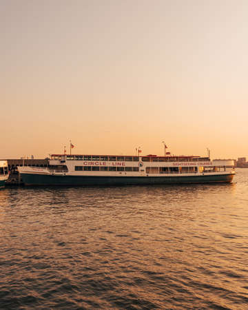 Circle Line sightseeing boat at sunset, seen from Pier 84 at Hudson River Park, in Manhattan, New York City