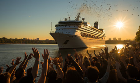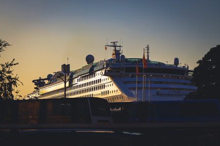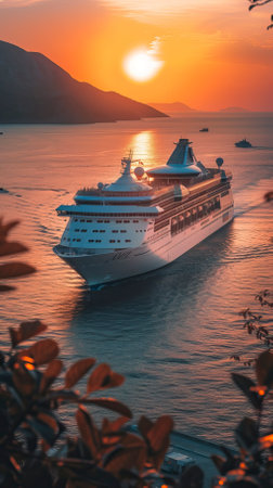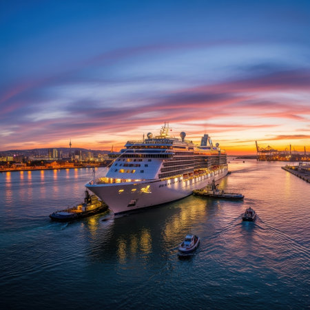 A majestic cruise ship rests in a harbor at sunset, its illuminated Nov 16 2025