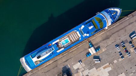 Aerial view cruise ship parking the pier, Cruise ship at harbor. Aerial view beautiful large white ship, Top view from drone of luxury cruise ship floating liner, Covid-19 check.