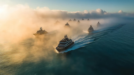A stunning aerial view of a fleet of luxury yachts gracefully navigating through misty waters at sunrise, showcasing tranquility and adventure.