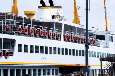 Istanbul, Turkey - October-27.2019: Rear view of the ferry anchored in the pier. One of the oldest ferries. Photographed on a cold day in cloudy weather.