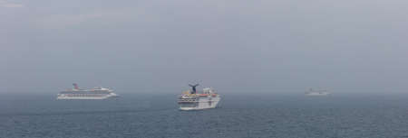 The Caribbean Sea - May 26, 2020: Aerial panoramic shot of Carnival Elation, Carnival Legend and Carnival Paradise anchored at sea in the fog. Gray foggy sky in the background.