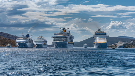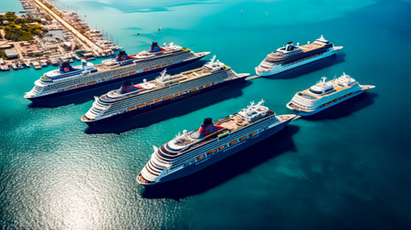 Group of cruise dock ships in harbor next to each other on sunny day. Generative AI.