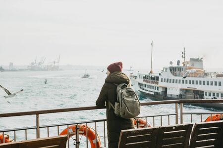 A student or tourist girl is standing on the deck or sailing on a ferry along the Bosphorus in Istanbul and enjoys beautiful views.