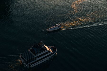 Aerial view of the boat in clear blue water at sunset in summer. Vancouver, canada.