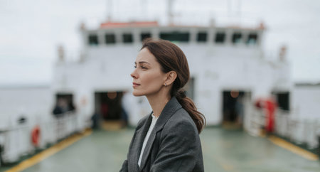 A woman is on a ferry deck. She looks out towards the water with a serious expression. The sky is cloudy. The ferry is moving through the water.