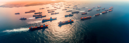 Generative AI : Aerial view of anchored ships waiting their turn to enter the Bosphorus at the Black Sea coast of Istanbul Turkey