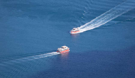 Aerial Drone Flight: Two Ferrys sailing in ocean. Travel Vacation Recreation Paradise Tourism. Beautiful nature landscape, Tropical Nusa Penida Island, Indonesia. Cinematic filter