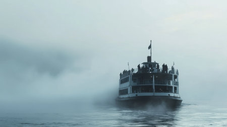 A large ferry moves through thick fog on calm waters during a misty early morning. Passengers enjoy the serene atmosphere while surrounded by haze and silence.