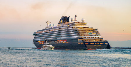 Miami, Florida, USA - December 21, 2024: Ship departing harbor. Explora II cruise ship voyage. Cruise in summer vacation. Explora Journeys cruise line. Cruise ship tour. Travel by sunset sea