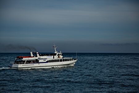 Passenger ferry at sea with cloudy sky