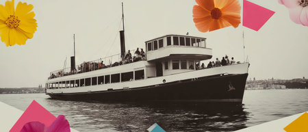 Minimalist collage featuring a ferry boat with geometric shapes and flowers in a serene setting