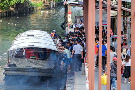 Bangkok-Thailand NOV 11 2018: People are taking a boat ride at Saen Saep Canal at Pratunam pier, express boat service at Saen Saeb Canal is an alternative way to help people travel faster.