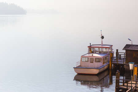 A docking boat in a lake in misty early morning light, empty space for text