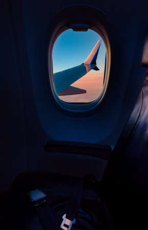 View from the porthole of the airplane window with blue sky and clouds