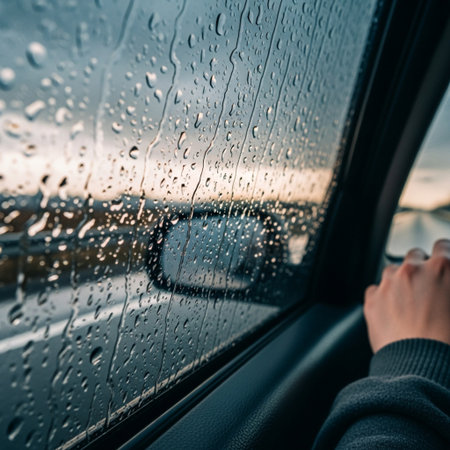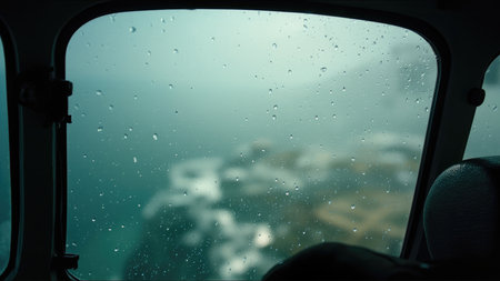 Raindrops on a window obscure a blurred landscape viewed from inside a vehicle creating a moody atmosphere.