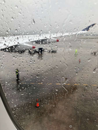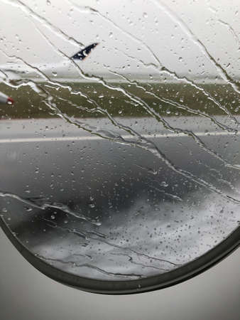 Rain drop at Airplane window before take off when monsoon season.