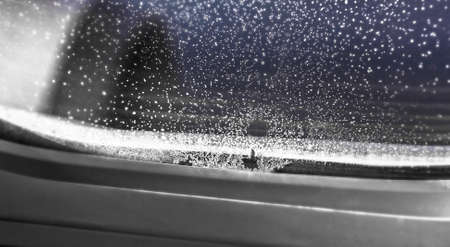 Ice and snowflakes in window of plane
