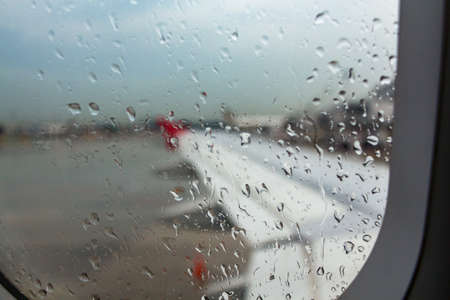Raindrops on window of aeroplane on parking.