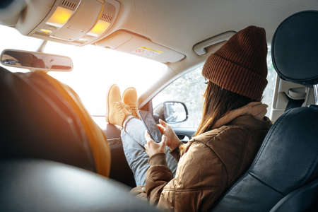 Beautiful young woman wearing warm clothes sitting in car while winter road trip