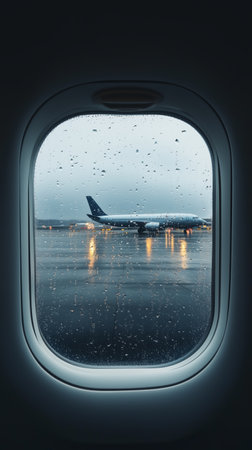 Rain-soaked airplane view from a passenger window while preparing for takeoff at dusk
