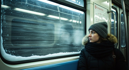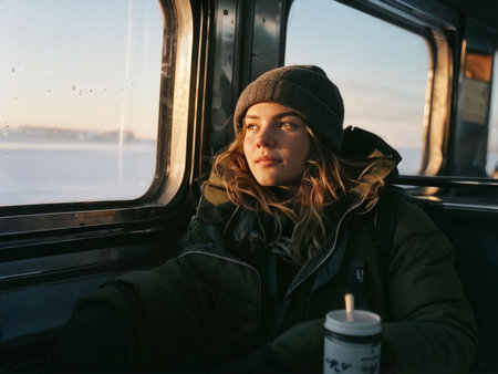 Young woman in winter clothes looks out the window of a train.