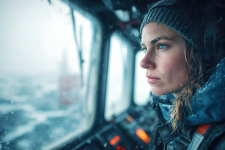 Back view of train driver operating locomotive through snowy urban landscape, showcasing transportation industry and winter weather challenges.