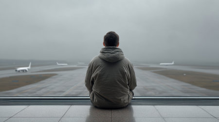 A thoughtful person sits quietly by an airport window, gazing out at the runway and distant airplanes on a gray, overcast day, reflecting on travel and solitude.