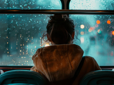 Back view of a young woman sitting in a bus and looking at the rain