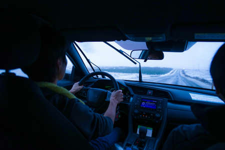 Car trip on a winter sunny evening