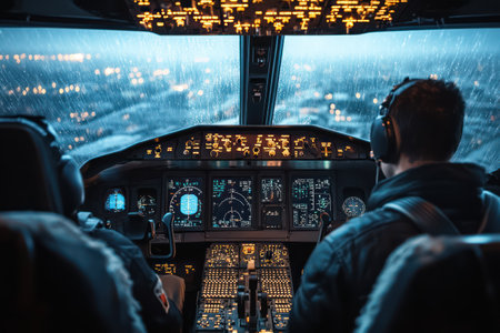 Airline pilot in cockpit flying aircraft through dramatic cloudscape viewed from flight deck with illuminated instrument panel during atmospheric flight conditions.