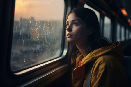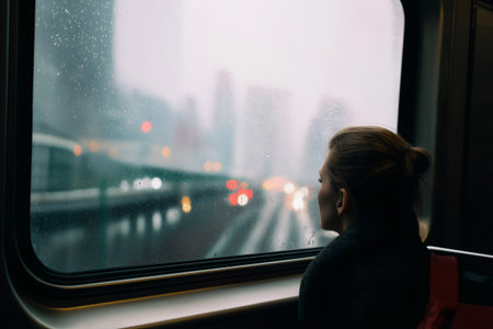 Businesswoman gazing thoughtfully through the train window, watching raindrops cascade down while traveling through a bustling cityscape