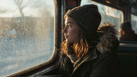 Young woman in winter clothes sitting in the train and looking at the window