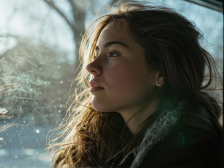 young woman sitting in a winter window