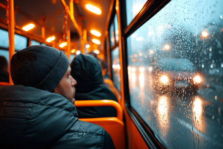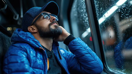 Man looking out rainy train window ai generated