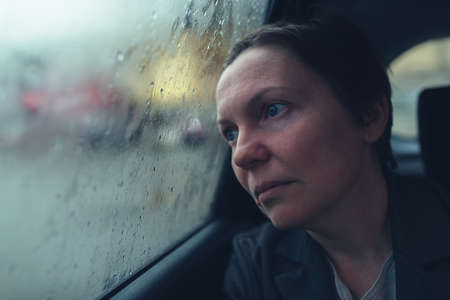 Disappointed and worried businesswoman looking out the window of taxi vehicle on cold rainy day on her way to work, selective focus