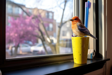 pencil holder next to bird feeder on office window sill, created with generative ai