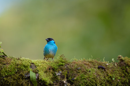A vibrant bird with blue and yellow plumage rests on a mossy surface. The composition showcases the bird against a backdrop of blurred green vegetation. The earthy tones of the ground contrast with the bird's bright colors, suggesting a natural outdoor environment suitable for various commercial uses.
