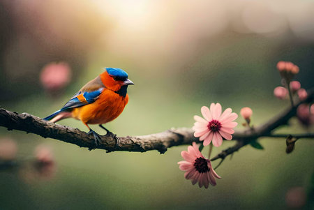 A vibrant bird rests gently on blooming flowers, showcasing stunning colors in a serene natural setting. The warm light enhances the beauty of nature's finest moments.