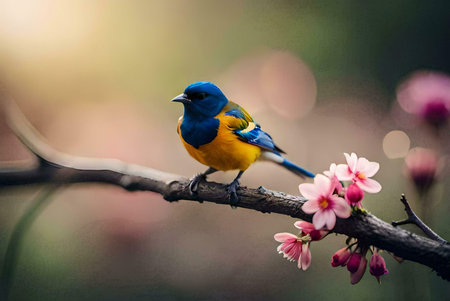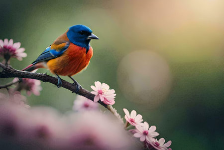 A vivid azure songbird rests delicately on a blooming cherry branch, surrounded by lush pink petals that evoke spring?s lively and cheerful essence.