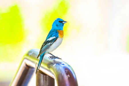 A beautiful vibrant painted bunting is perched on a brick wall, showcasing its stunning colors and plumage details in a natural outdoor setting