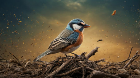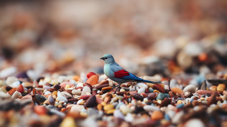 A small bird standing on a pile of rocks and pebbles, AI