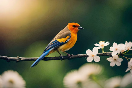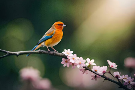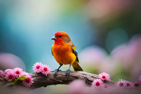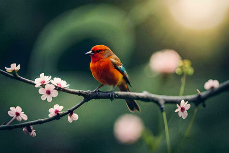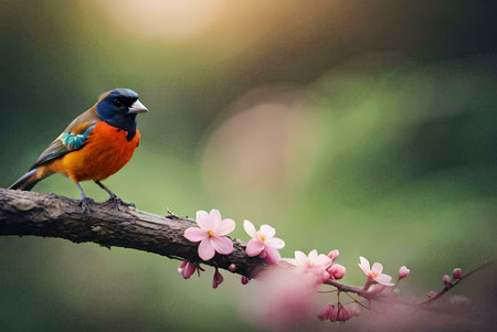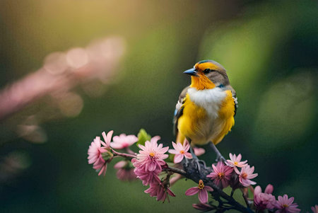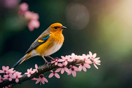 a small bird perches on a moss-covered branch in the norwegian wilderness, showcasing a beautiful blend of dark yellow and orange hues. the bird strikes a dignified pose, reminiscent of wimmelbilder and whistlerian art styles. this national geographic photo captures the essence of cranberrycore aesthetics in the midst of stunning norwegian nature. ai generated