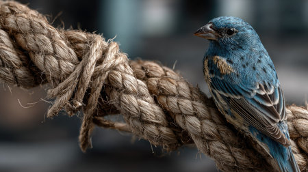 A vibrant blue bird elegantly perched on textured natural rope, showcasing intricate feather patterns and serene beauty in soft natural light.