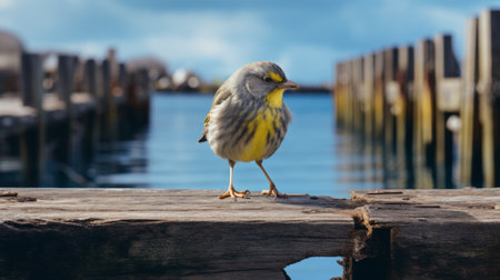 a naturalistic bird portrait captured by matthias haker, featuring a detailed character design in yellow and gray tones. the coastal and harbor views in the background are complemented by the serene presence of water. this high-resolution image by dora carrington showcases the beauty of nature and the artist's meticulous attention to detail. ai generated