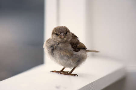 Young sparrow is standing in the grass on the lawn. Portrait of the bird. Close-up.