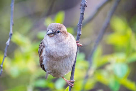Sparrow sitting on a green branch in spring in the sunset light. Sparrow with playful poise on branch in spring or summer